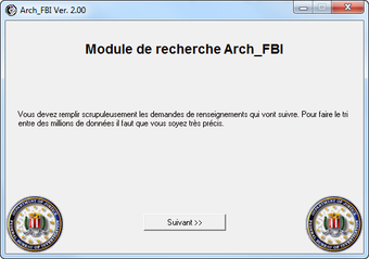 Arch_FBI est un petit logiciel gratuit prévu pour faire une blague à vos amis. Il suffit d'envoyer le programme en fichier joint. Le destinataire clique pour l'ouvrir et lit en préambule: "Savez-vous que le FBI possède en archives photographiques 73 % de la population totale de la planète?" On lui demande ensuite de s'identifier pour découvrir si oui ou non, il figure dans les fichiers du Federal Bureau of Investigation... Suspense!